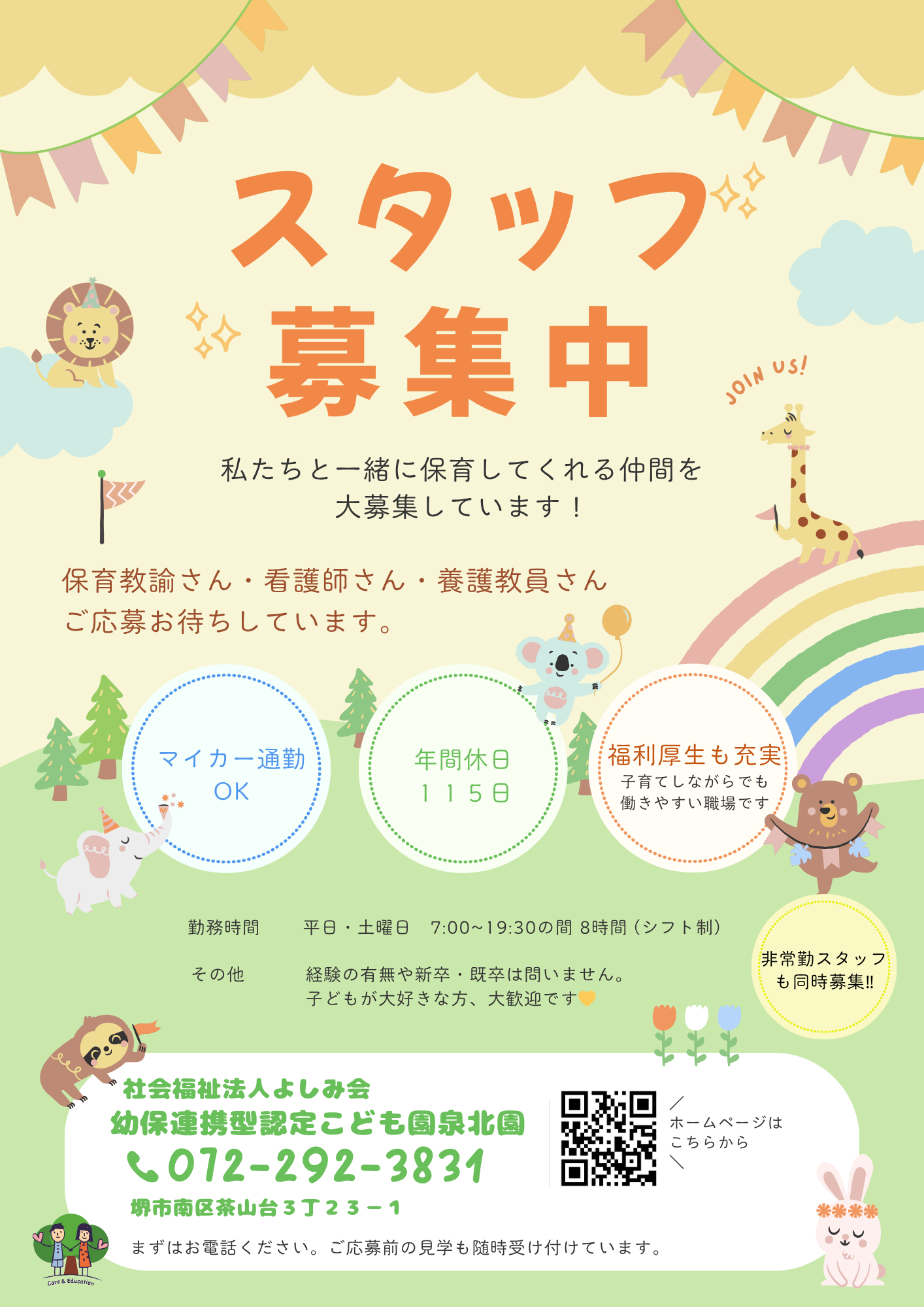 泉北園では、保育教諭、看護師、養護教員を募集しています。